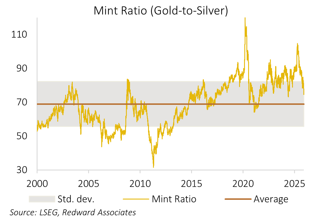 The rally in silver has far-surpassed that of gold, sending the Mint Ratio - the ratio of gold-to-silver - down to 74.6:1. At the start of the year, the Mint Ratio was 90.9:1 and it climbed briefly to a high of 104:1 during the peak of the Liberation Day market sell-off. The plunge in the Mint Ratio brings it within range of its post-millennium average (69:1) but well off its trough (31.7:1) achieved in April 2011.