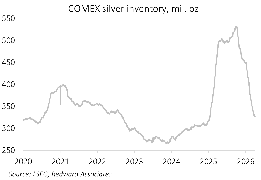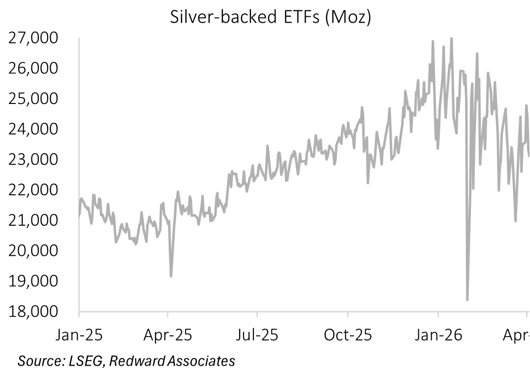 Net open non-commercial positions in silver stabilized in March at 116Moz, down 27Moz from year-end. The decline in US investor interest in silver is also evident in bullion held in COMEX approved vaults. Vault holdings peaked on the 3rd of October 2025, at 531.9Moz, and has subsequently declined 204.2Moz.