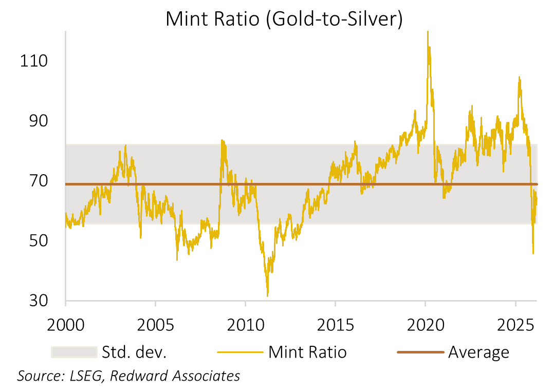 As silver is both a precious and industrial metal and its market liquidity is considerably lower than gold, the Mint Ratio – the ratio of gold-to-silver tends to be sensitive to both demand for precious metals and global economic growth expectations. This pattern of behavior has been evident recently, with the Mint Ratio rising from a cyclical low of 46:1 in late January to around 64:1 currently.