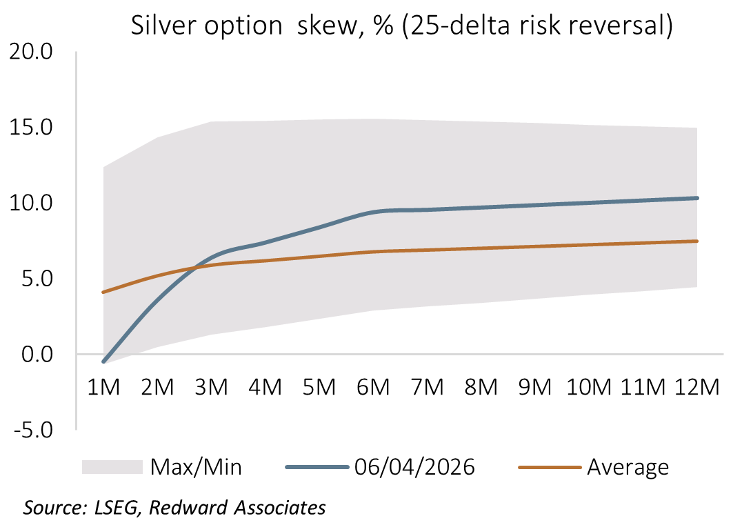 This instability is evident in option volatility skew. After hovering as high as 12% in favor of US dollar call options through end-February/early March, the one-month 25-delta risk reversal skew has tumbled to -0.8%, suggesting scope for near-term weakness. However, while the options market sees scope for near-term weakness, option skew is strongly in favor of silver call options beyond one-month, with twelve-month 25-delta option volatility skewed 10.3% in favor of silver calls, well above its past decade average of 2.8% (average is past 12-months).