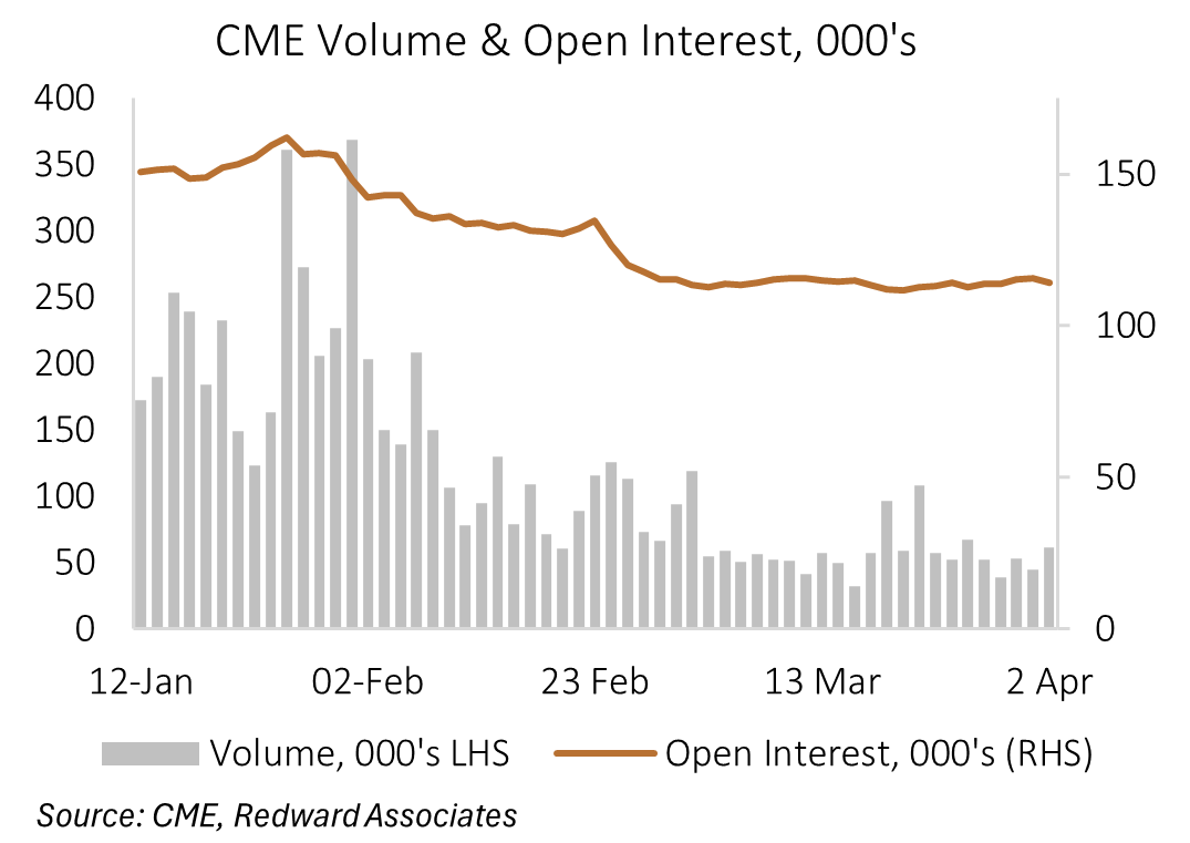 Average daily trading volume in the 5,000oz silver futures contract is down 72% between the second half of January and the second half of March. This is despite the price of silver falling 27% and the CME lowering the silver margin requirement 4pp, to 14%, with the combined effect lowering the US dollar value of margin required by 44%.