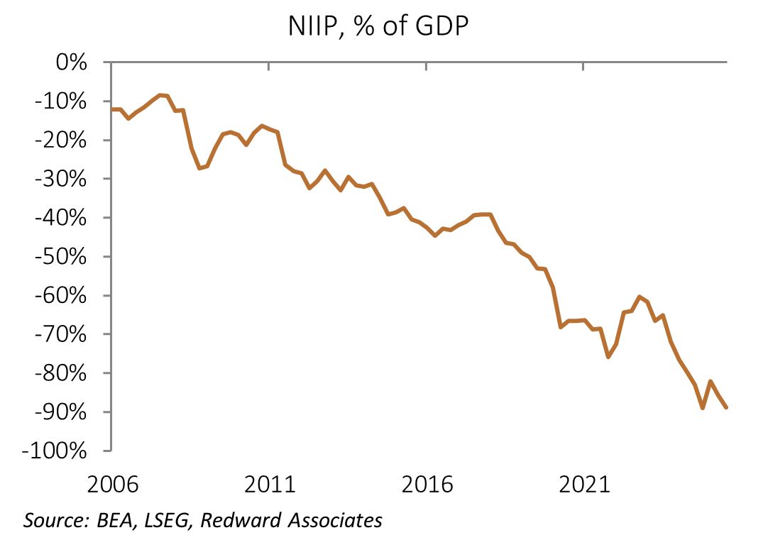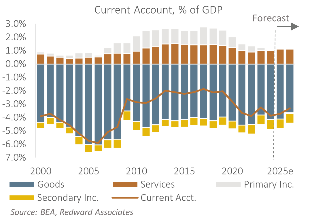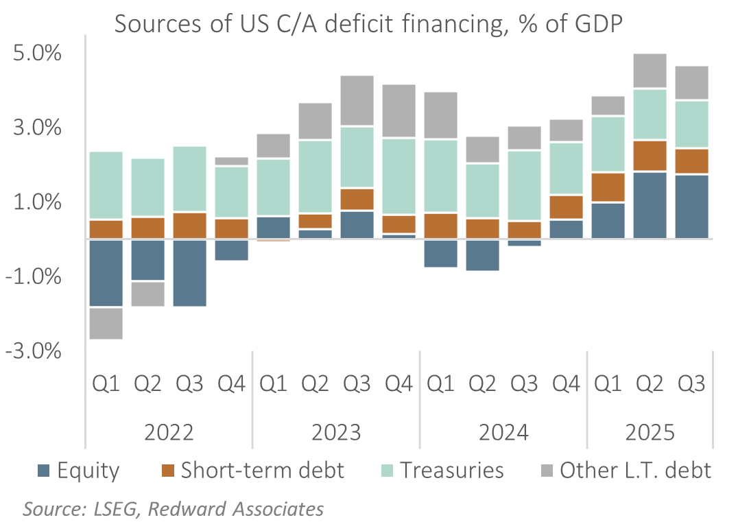 I project the US ran a current account deficit in the region of USD 1,130bn (3.7% of GDP) last year, with my initial projection suggesting a slightly smaller deficit this year at USD 1,050bn (3.3% of GDP), but this is due largely to leads-lags in purchases ahead of the tariff announcement in April 2025.