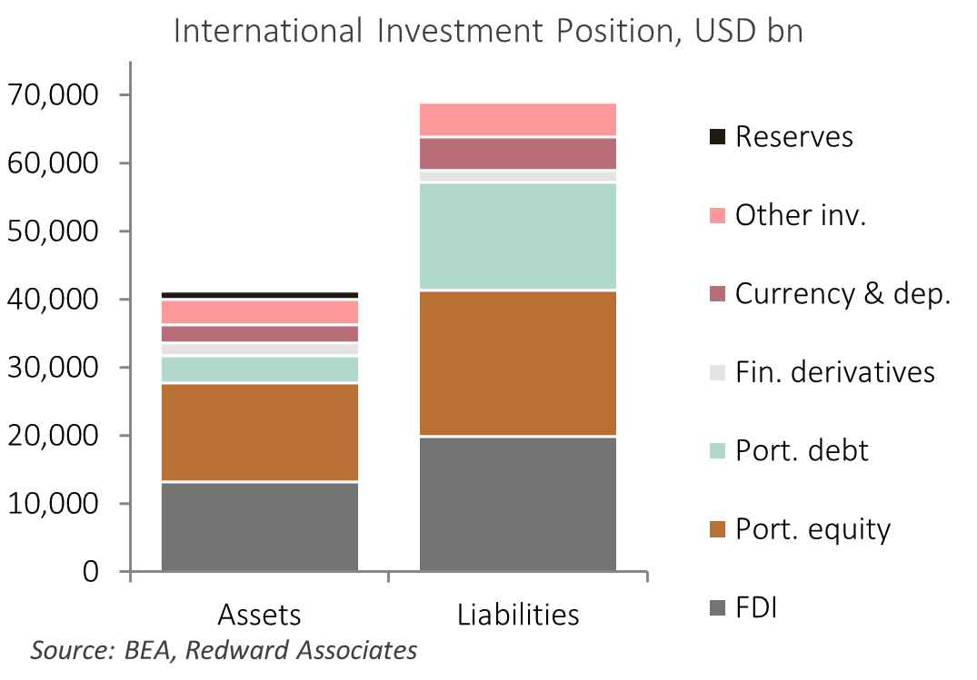 While the US net international liability is substantial, this is dwarfed by US gross liabilities. Gross liabilities amount to USD 68.89 trillion (221.5% of GDP). Of those, USD 15.8 trillion is portfolio debt, mostly in the form of US Treasury bond holdings (USD 7.83 trillion) with corporate and agency debt (USD 6.29 trillion) and Treasury Bill holdings (USD 1.42 trillion). However, this doesn’t fully capture the scale of debt holdings, with US currency and deposit liabilities (USD 4.85 trillion) and loans (USD 4.54 trillion) also substantial. Total debt-creating capital liabilities amount to a remarkable USD 29.25 trillion.