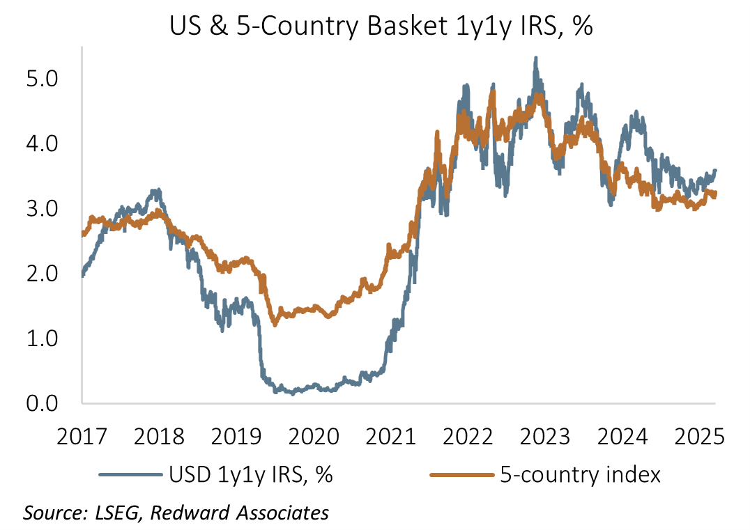 There are multiple factors supporting demand for US fixed income securities. Foreign Central Banks will purchase US bonds as part of their own foreign exchange management policies, commercial banks will hold US securities for macro-prudential reasons, and investors will hold them as part of their investment benchmark, subject to perceptions of return. While investors have multiple reasons for holding US dollars, ultimately, they come down to a view on expected return, or Uncovered Interest Parity, which states that foreign and domestic interest rates should equilibrate once expected exchange rate changes are factored in. Using the one-year interest rate swap one-year forward as an indicator, the yield differential between the US 1y1y IRS and its 5-country basket weighted equivalent is only around 35bp, minimal when one considers how expensive the US dollar is. Simply put, the limited yield differential suggests foreigners expect the US dollar to remain robust, which strikes me as improbable.