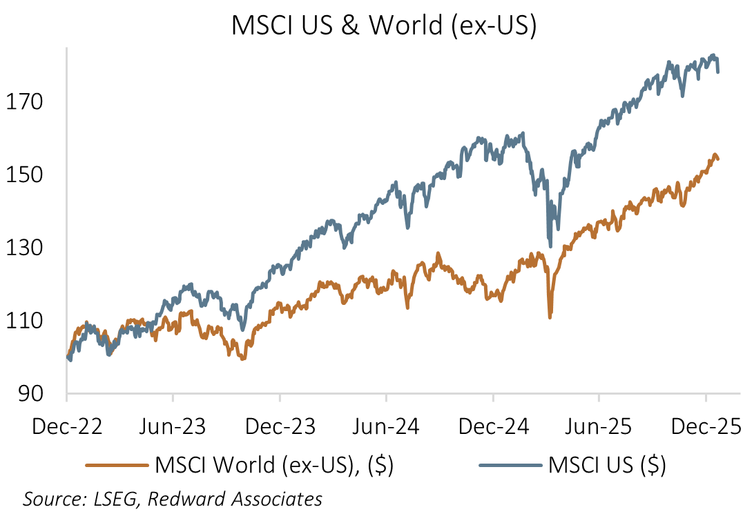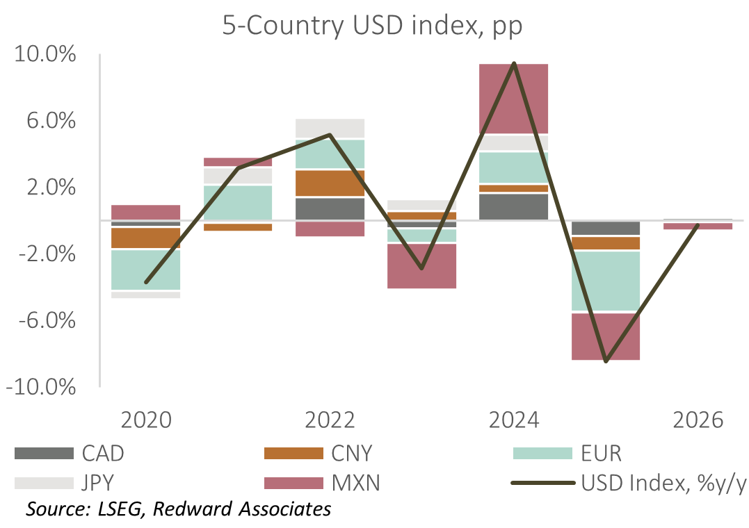 Rather than look at the popular US dollar index (DXY) which is highly European-centric, I prefer a 5-country basket based on the euro, yen, renminbi, Canadian dollar, and Mexican peso. Based on this basket, the US dollar peaked on the 10th of January 2025 and has subsequently declined 8.6%. Since the end of 2024 the US dollar index has weakened 8.5% driven largely by the EUR (3.4pp), MXN (3.4pp), CNY (1.0pp), CAD (0.8pp) while the JPY (-0.1pp) has been steady.