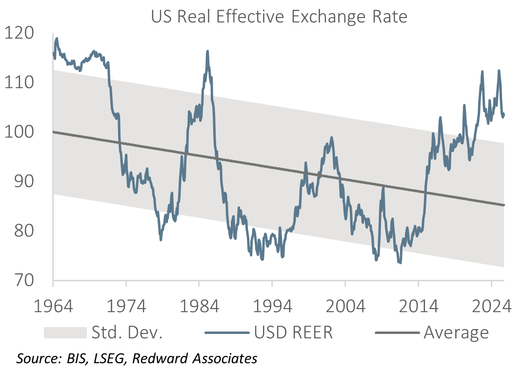 While the US dollar has fallen from its pre-Inauguration high, it remains around 20% above its long-term (1964-2026) downtrend on a broad real effective exchange rate basis (BIS data).